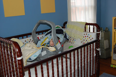This is how our little chicken has been sleeping since his nose has been too stuffy to breathe laying flat. He has really taken to the whole carseat-in-the-crib scheme and is peacefully sleeping in this same getup as I type. No, I do not strap him in to take naps. This nap started post-shots at the doctor's office and went straight to the crib.